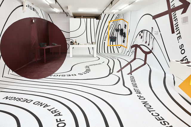 Customers at the exhibition will be fully immersed in the concept of pi. Each piece of the Collection will be displayed in graphic illusions that accentuate the integration of pi throughout the assemblage. Working in conjunction with Moonstruck Films, the gallery space will feature pi-inspired curves on the walls and floor and will display other illusions that reference the infinite. During certain times of the day, the cellist and composer Ken Kuo will play a piece based on the numbers of pi while the performance artist Gabriela Alvarado will use her body to interact in free-form, non-verbal style to encourage customers to consider the products from different perspectives.
