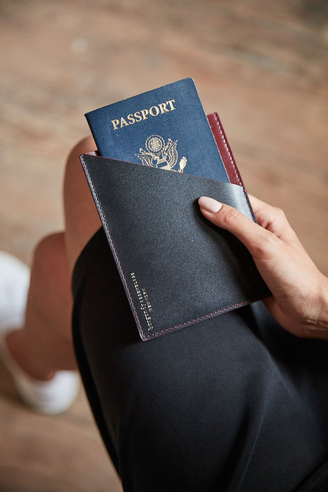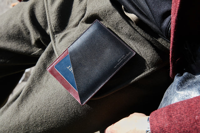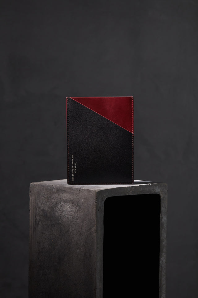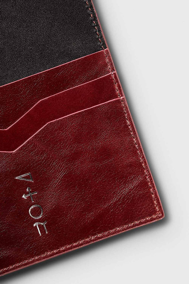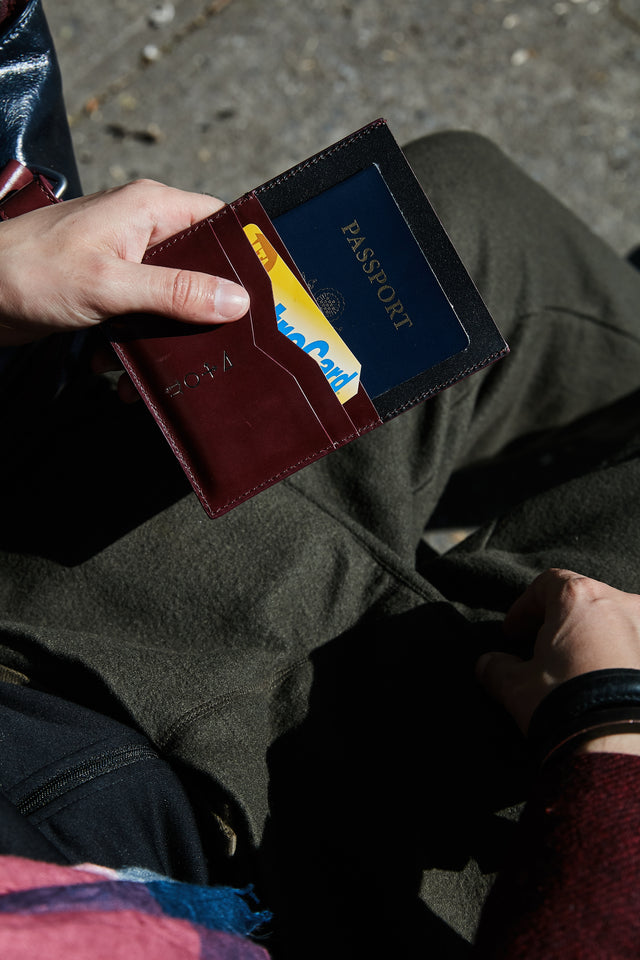 Eta, our sleek handcrafted passport sleeve, is a must for the international traveler. Elegant yet functional, the sleeve has five cotton-lined compartments: one for a passport, one for boarding passes, the other for cash, cards or even a second passport. Eta is made of black and burgundy calfskin leather, a light, smooth and durable material that will protect your travel documents for years.